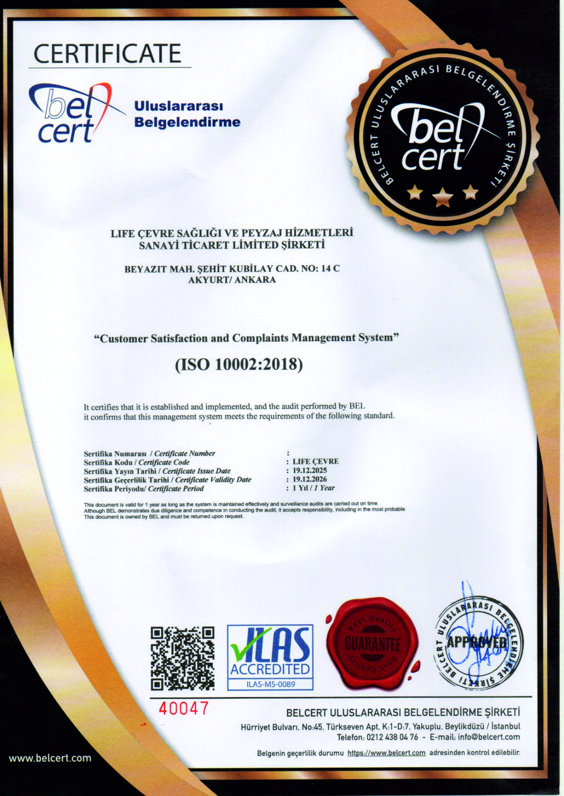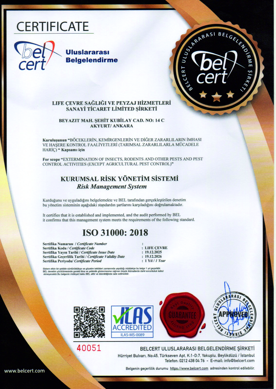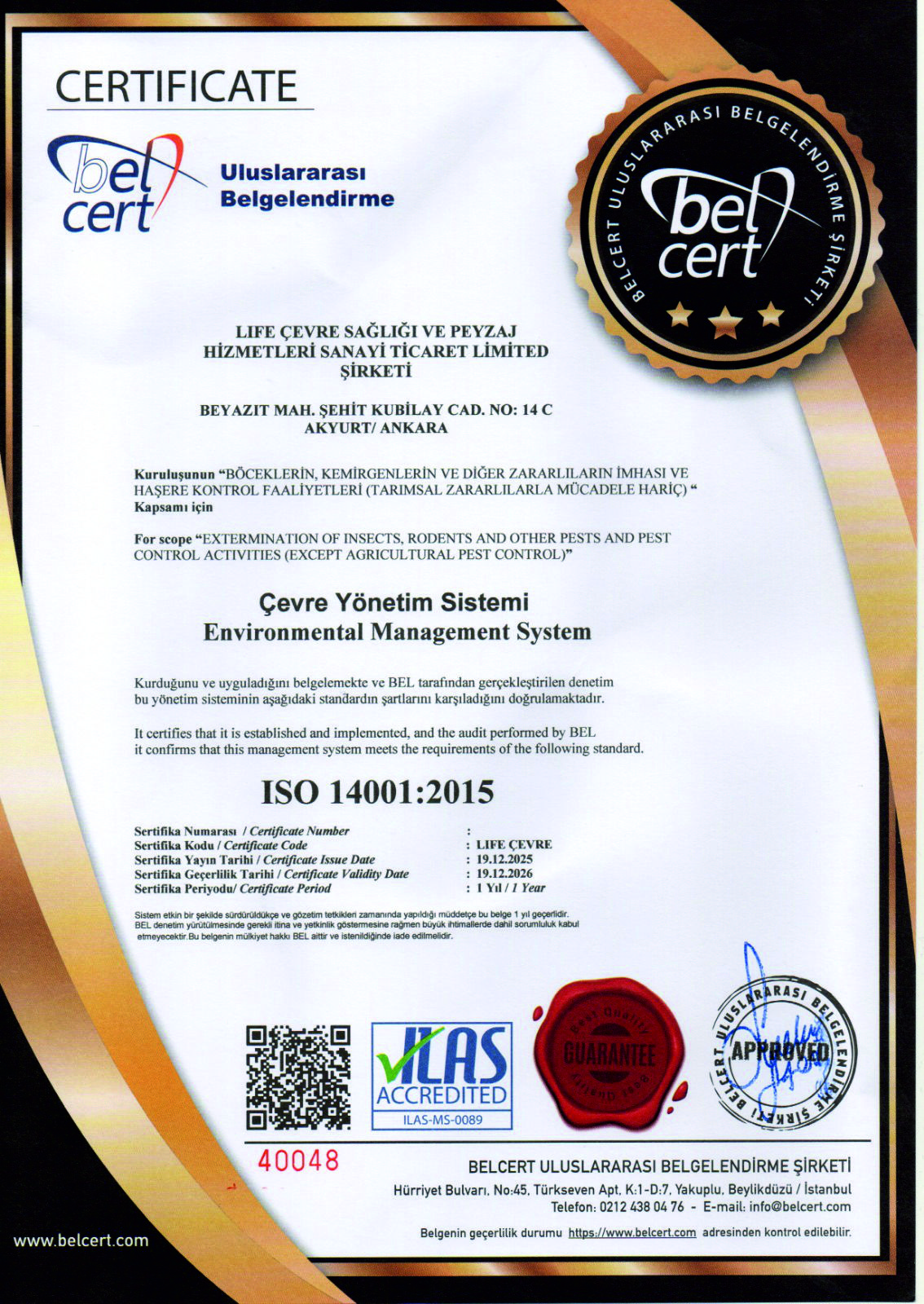 Life Çevre Sağlığı ve Peyzaj Hizmetleri olarak, hizmet kalitemizi sürekli artırmak ve sektörümüzde öncü olmak için ulusal ve uluslararası kalite standartlarına uygun hareket ediyoruz. Bu kapsamda, Türk Standartları Enstitüsü (TSE) başta olmak üzere çeşitli kalite ve yeterlilik belgelerine sahibiz. Life Çevre Sağlığı ve Peyzaj Hizmetleri olarak, hizmetlerimizi yürütürken ilgili tüm yasal mevzuatlara ve sektörel düzenlemelere tam uyum sağlamayı temel prensip ediniyoruz. Müşterilerimize güvenilir, kaliteli ve yasalara uygun çözümler sunmak için gerekli tüm yetki belgelerine ve sertifikalara sahibiz.